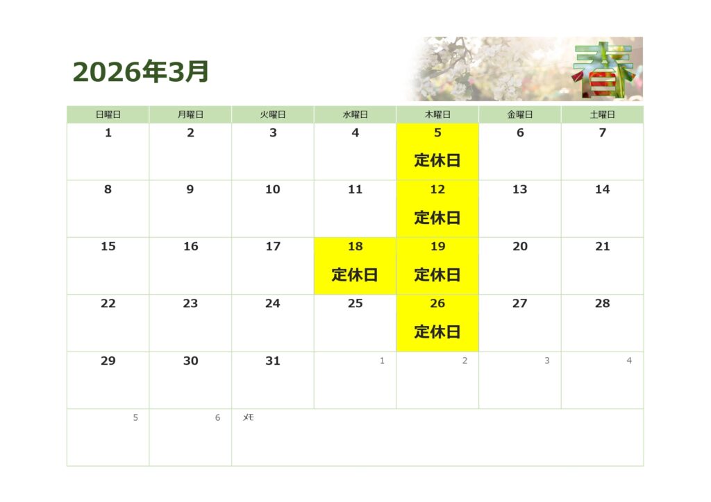 1月 定休日のお知らせ